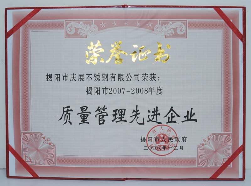 2000年3月被评为重合同守信用单位 2003年—2006年连续四年被评为全国外商投资双优企业2004年获得银行系统AAA级企业称号2004年9月获得广东省名牌产品称号2004年7月 广东省质量协会单位会员2000年-2005年劳动管理信得过单位2005年3月获得广东省著名商标2005年被评为中国质量检验协会团体会员单位2004年-2006年连续3年被评为纳税光荣户2007年获得国内不锈钢企业唯一“中国驰名商标”